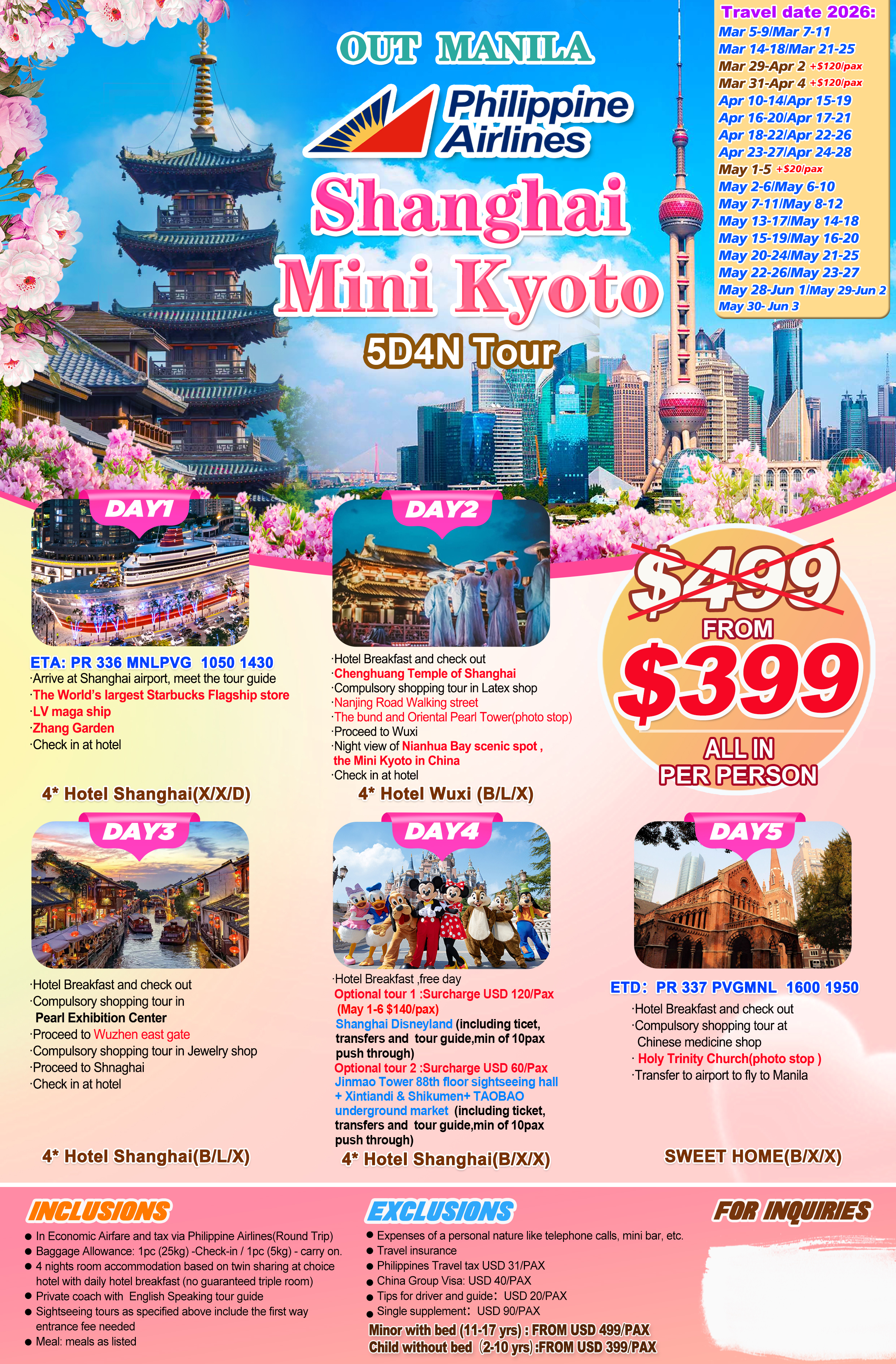 MNL | $ 399 | $ 200 | Philippine Airlines | 2 | china.allin@uostravel.com |