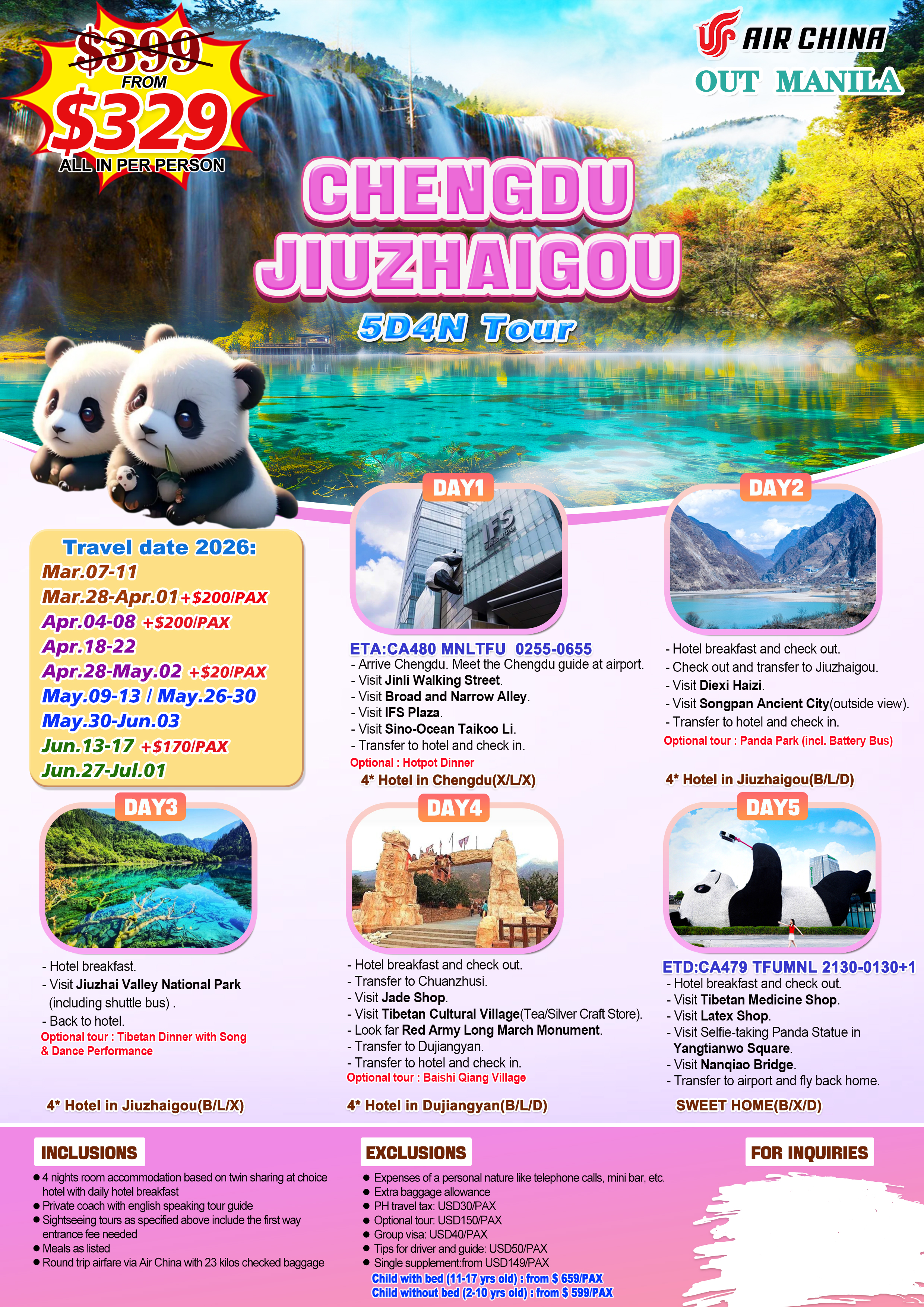 Chengdu+Jiuzhaigou 5D4N (CA),2026, out Manila