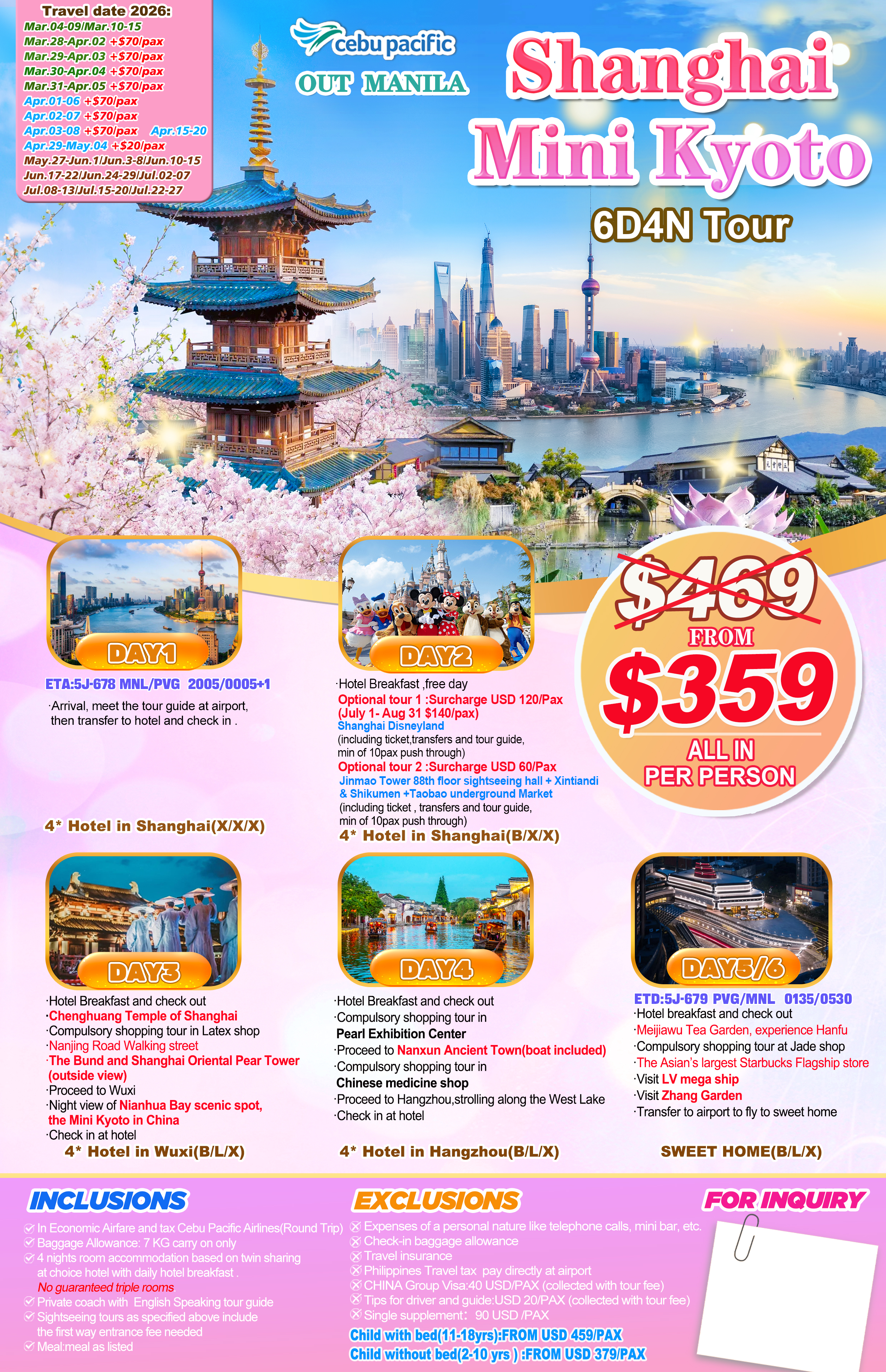 MNL | $ 359 | $ 150 | Cebu Pacific Air | 21 | china.allin@uostravel.com |