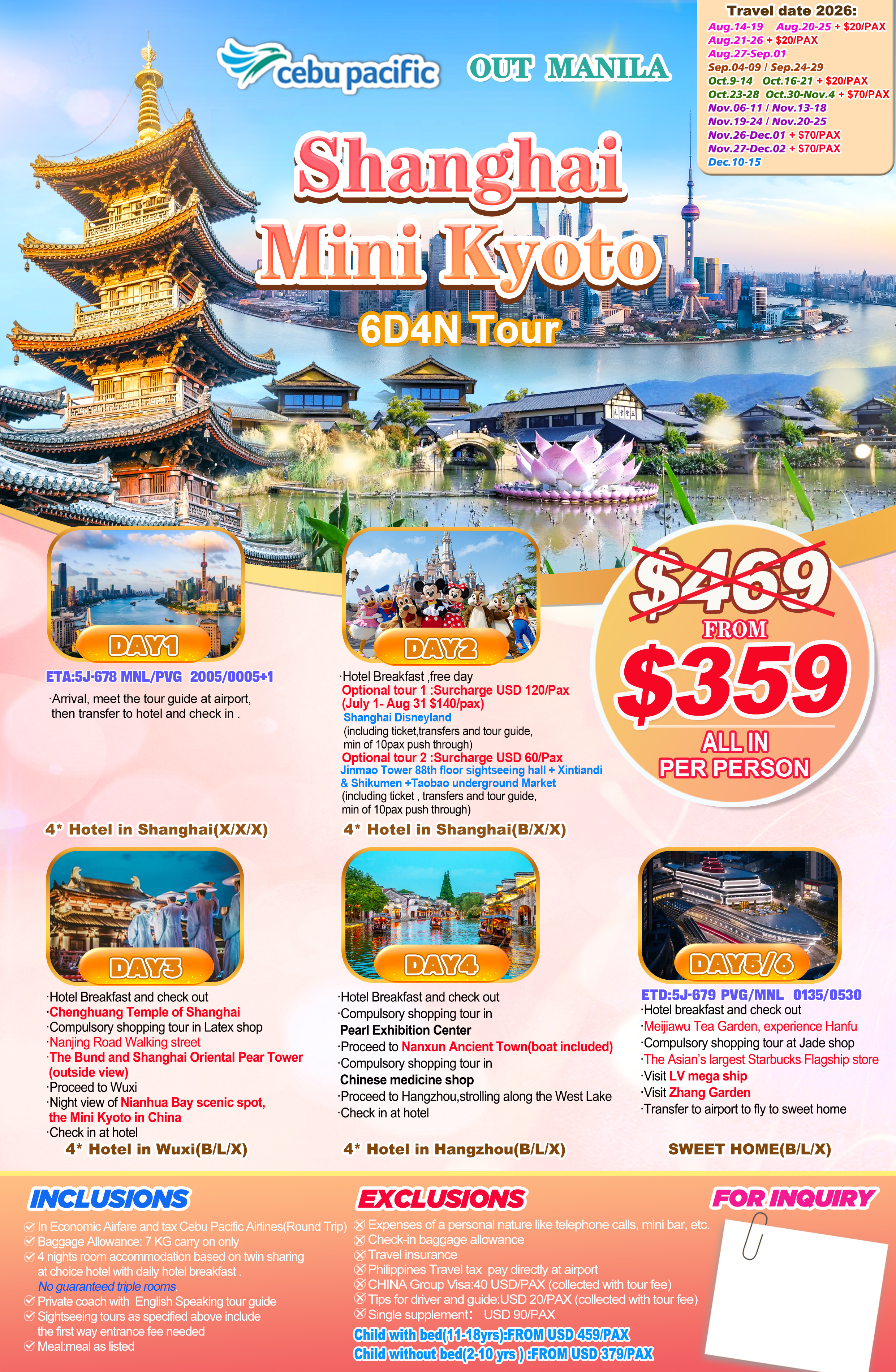 MNL | $ 379 | $ 150 | Cebu Pacific Air | 30 | china.allin@uostravel.com |