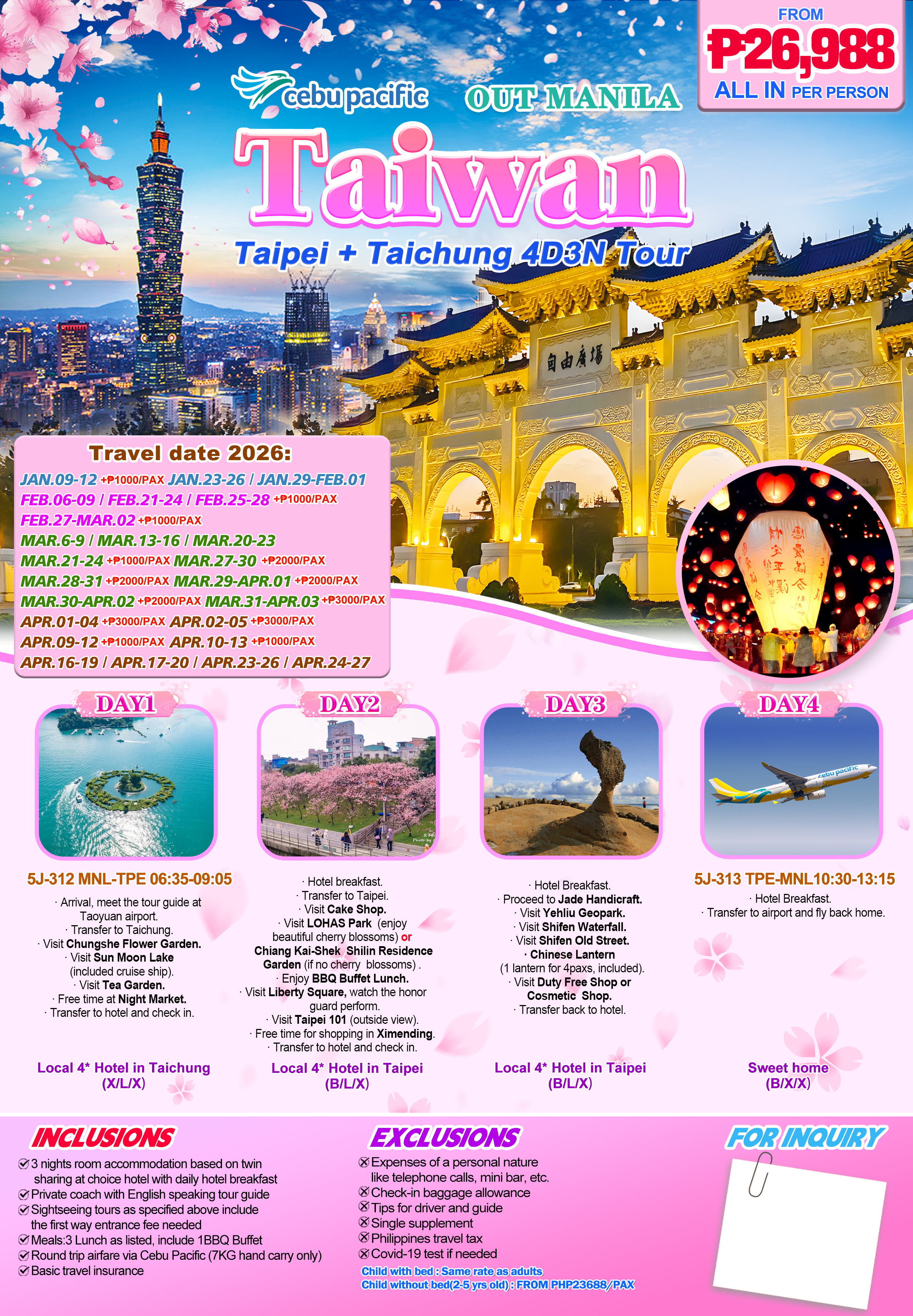 MNL | ₱ 26,988 | ₱ 12,000 | Cebu Pacific | 27 | taiwan.allin@uostravel.com |