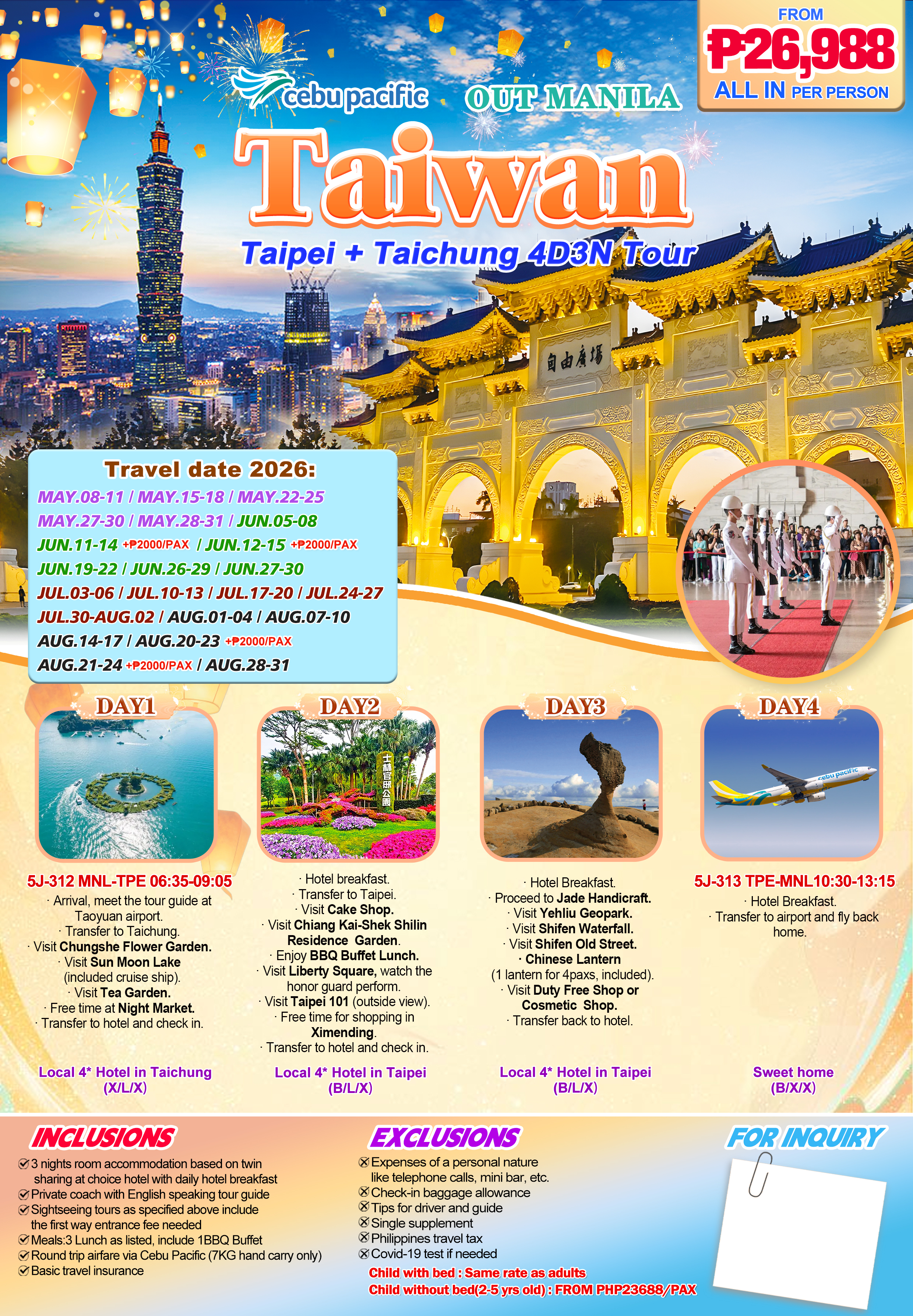 MNL | ₱ 28,988 | ₱ 12,000 | Cebu Pacific | 11 | taiwan.allin@uostravel.com |